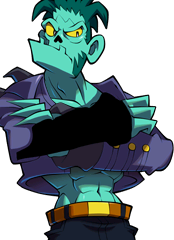 Abner is a muscular green zombie with yellow eyes and dark green hair. For attire, he wears a purple jacket, blue pants with a brown belt and gold buckle, and brown shoes.
