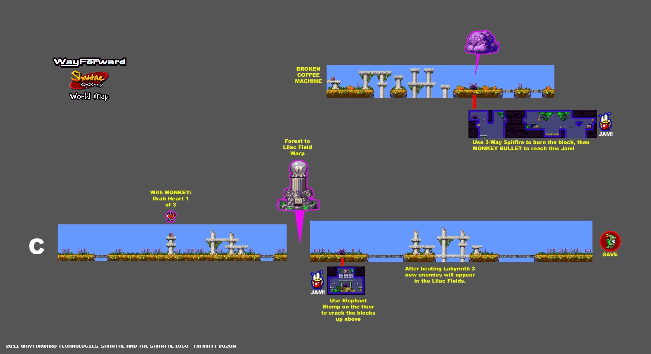 - A series of pits and caves leading to the Desert Passage. A boulder at the right entrance hides a cave with a Magic Jam that requires Mega Pike Ball or Spitfire to access. To the far left there is one final pit that can only be crossed with Monkey Bullet; on the other side is another Magic Jam.