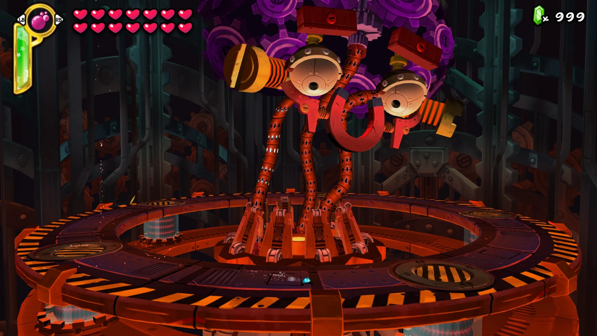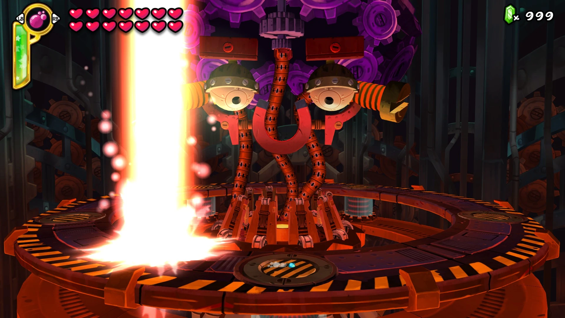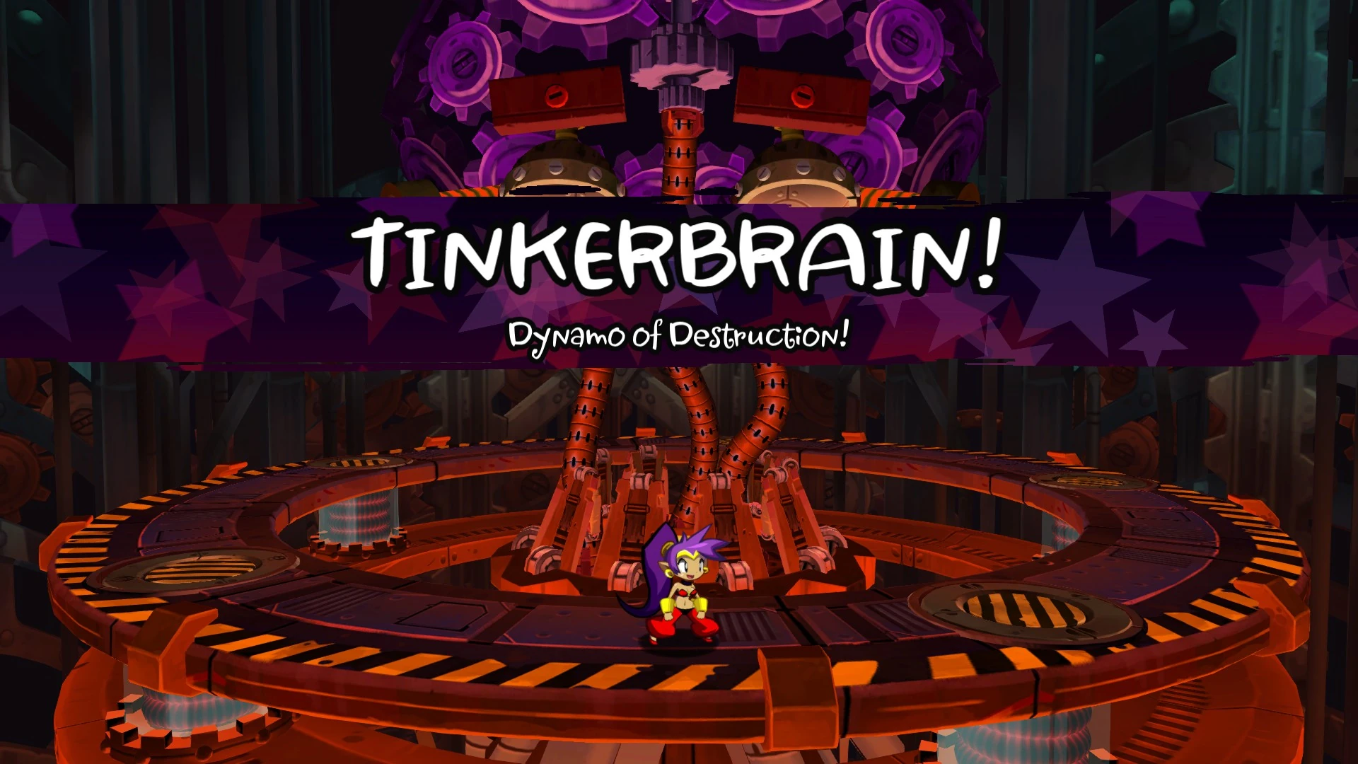 screw). The Tinkerbrain's protruding red screws change to green as the player makes progress by moving in the corresponding direction and change back to red if the player either stands still or moves in the opposite direction. The faster the player moves, the faster the screws are unscrewed. The Tinkerbrain sparks and nods his head to indicate that he is about to attack. If the player is unscrewing one of the Tinkerbrain's screws it will attack Shantae with a gear that bounces towards the player. If the player either stands still or reverses the progress they've made the Tinkerbrain will attack Shantae with a laser beam that slowly chases the player. Upon successfully unscrewing the Tinkerbrain's screw, the eye next to his screw turns red, power cells are raised from underneath the stage, and must be destroyed to progress. It takes 20 damage to destroy each power cell. Note that activated power cells near each other can cause an electrical discharge which damages the player if you are in-between them. Upon successfully lighting all of the power cells, the Tinkerbrain's tendrils light in a black and white pattern as the screw that the player unscrewed flies off. It's eye also turns from red to black, indicating the player's progress. Upon successfully unscrewing both screws the Tinkerbrain explodes and closes it's eyes which sets the stage for Phase 2.