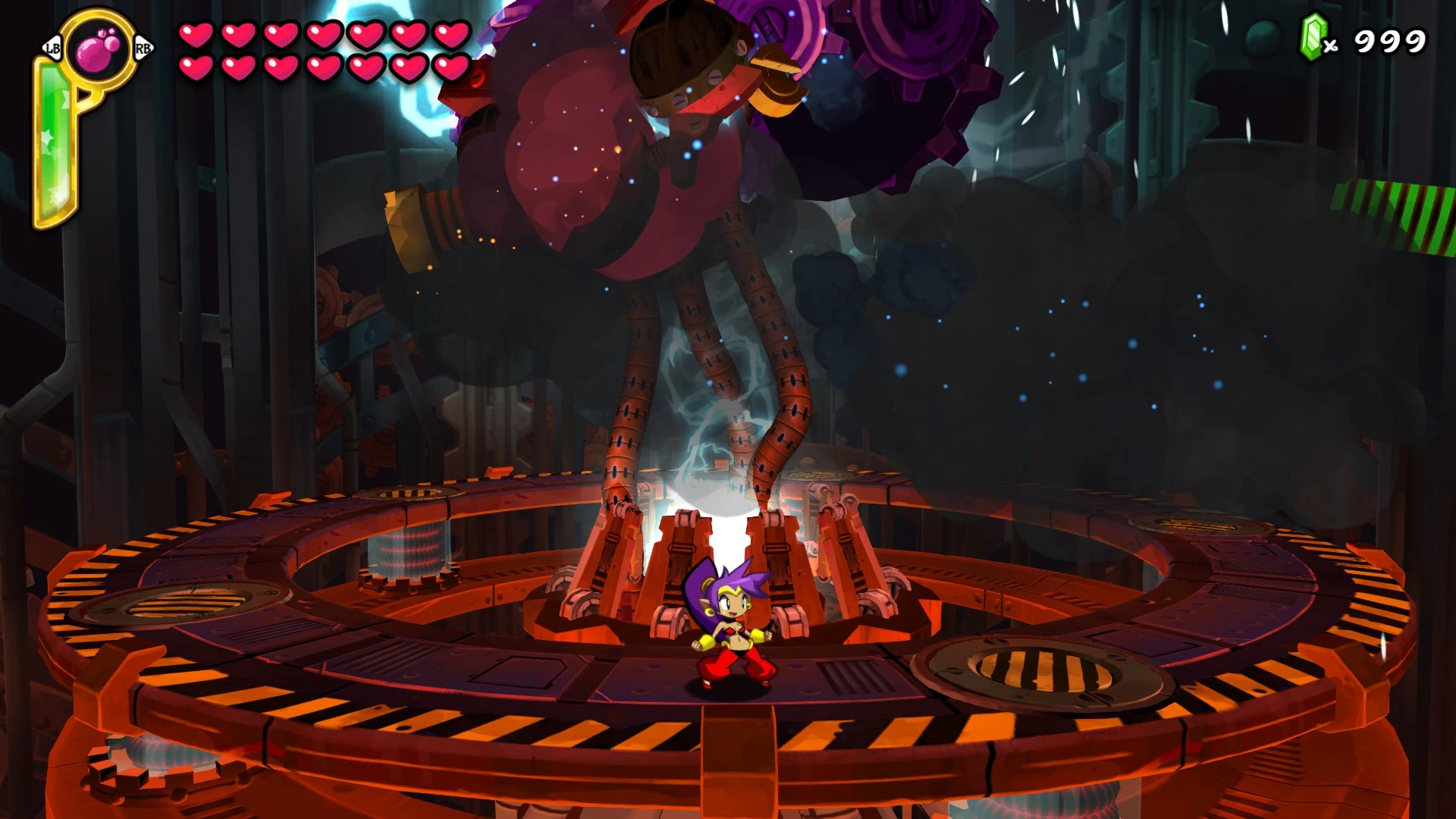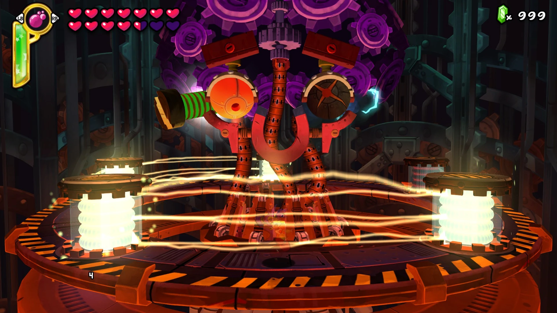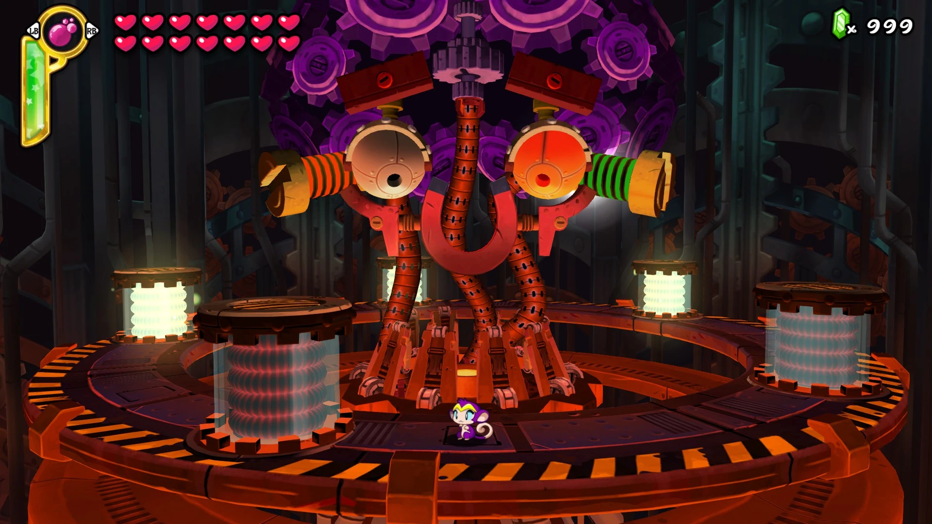 screw). The Tinkerbrain's protruding red screws change to green as the player makes progress by moving in the corresponding direction and change back to red if the player either stands still or moves in the opposite direction. The faster the player moves, the faster the screws are unscrewed. The Tinkerbrain sparks and nods his head to indicate that he is about to attack. If the player is unscrewing one of the Tinkerbrain's screws it will attack Shantae with a gear that bounces towards the player. If the player either stands still or reverses the progress they've made the Tinkerbrain will attack Shantae with a laser beam that slowly chases the player. Upon successfully unscrewing the Tinkerbrain's screw, the eye next to his screw turns red, power cells are raised from underneath the stage, and must be destroyed to progress. It takes 20 damage to destroy each power cell. Note that activated power cells near each other can cause an electrical discharge which damages the player if you are in-between them. Upon successfully lighting all of the power cells, the Tinkerbrain's tendrils light in a black and white pattern as the screw that the player unscrewed flies off. It's eye also turns from red to black, indicating the player's progress. Upon successfully unscrewing both screws the Tinkerbrain explodes and closes it's eyes which sets the stage for Phase 2.