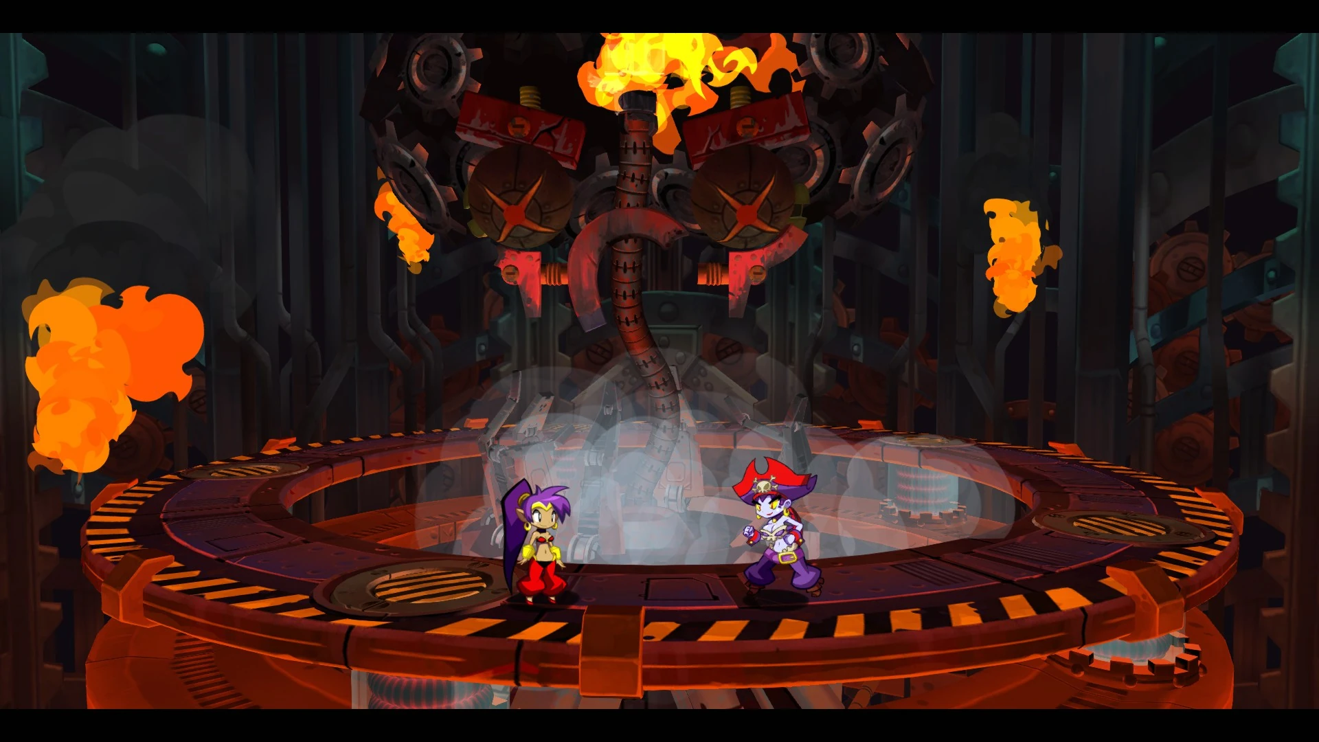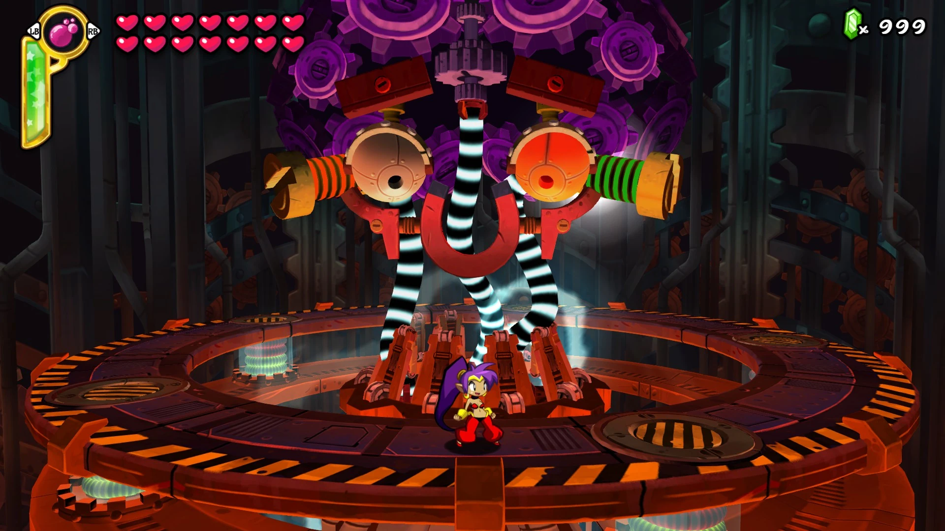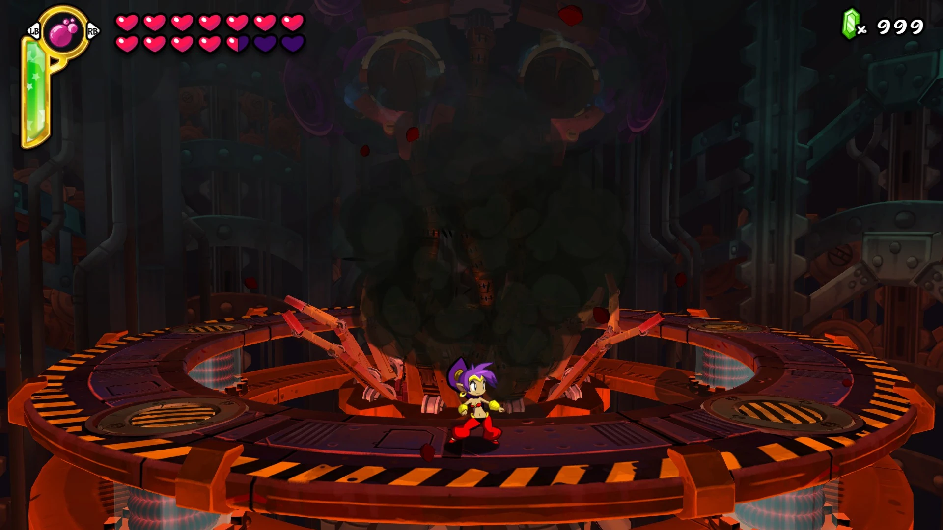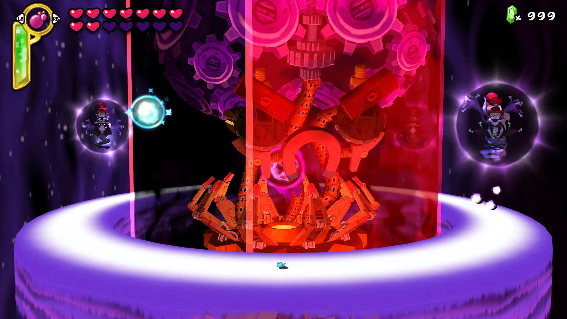 After Risky successfully uses the Tinkerbrain to take over the Genie Realm, Shantae must destroy the Genies's home dimension to ensure peace. The visual differences between Phase 1 and Phase 2 are the Tinkerbrain's angry eyebrows, angry frown (in the shape of a magnet) and shield. There are five genies total, four of which are shielded and cannot take damage while one is un-shielded. Genies have two of the following attacks, upon raising it's hands a genie can summon black darkness which quickly rotates around the stage before colliding with the opposite darkness spawned by another genie. After raising it's hands to reveal a white orb of electricity the genie will then fire four consecutive blasts of electricity orbs below themselves. The Tinkerbrain cannot physically attack the player but will shake to indicate that the shield revolution is either speeding up or speeding down. The player must find and attack the un-shielded genie to spawn a magical orb, upon doing so it's required that the player must attack the orb as the opening of the shield is revealed in front of your location. If the player does not attack an orb for 16 seconds the genie will return to her regular form. If a fired orb collides with the shield the Tinkerbrain does not take damage and time is briefly slowed to show the player that they've missed their opportunity. Upon getting hit with 10 orbs (100 damage) The Tinkerbrain explodes again as Shantae, Risky Boots, and the Tinkerbrain return to Risky's Hideout. The player is able to observe the charred remains of the Tinkerbrain before it explodes again, resulting in the destruction of Risky's Hideout and completing the game.